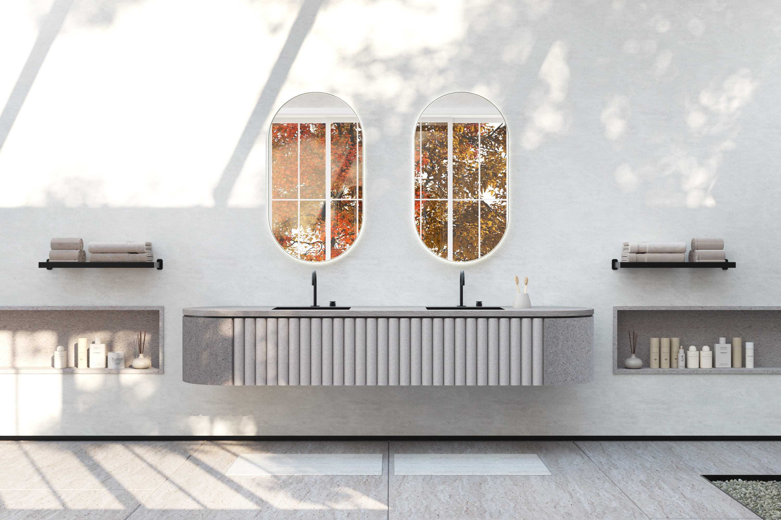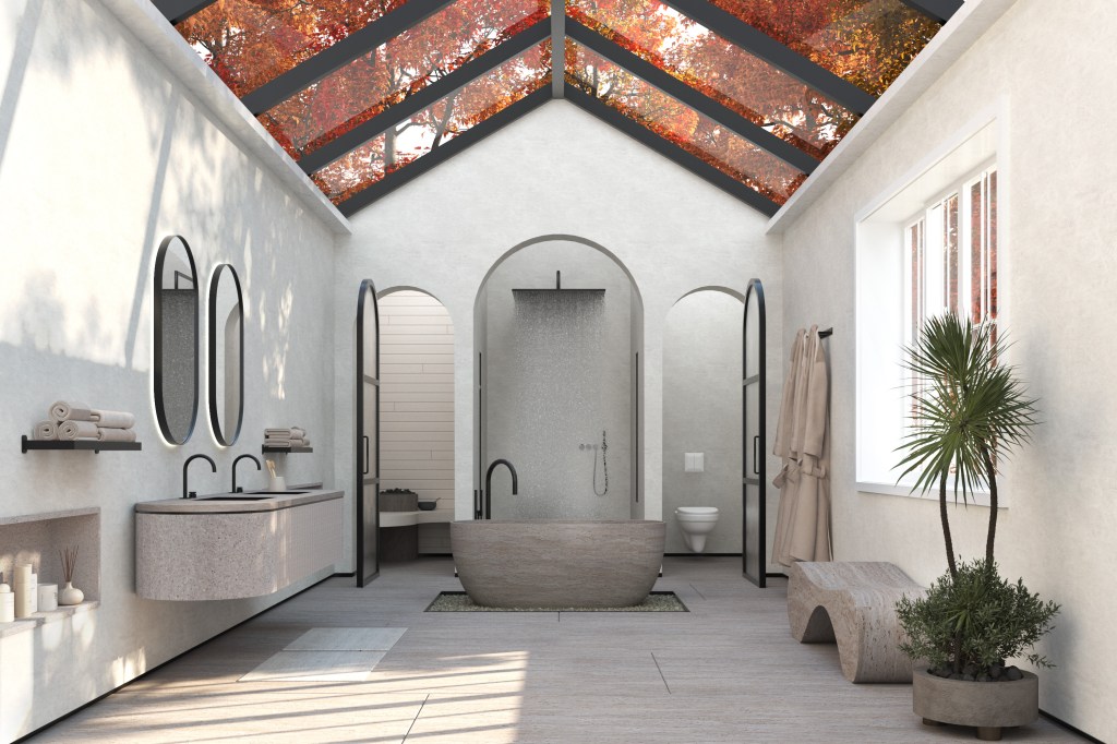 A recent client sought to expand their single-family home through a contemporary, design-forward renovation. Their primary goal was to increase usable square footage, with an open mind toward the final program. Initial ideas ranged from a studio office to a master bathroom suite, which became the focus of the first study. A restrained material palette fosters tranquility amidst suburban busyness. The bathroom features a glass roof that floods the space with daylight and frames views of the surrounding tree canopy, complemented by natural stone floors, marble accents, and a sliding window for enhanced ventilation and connection to the outdoors.