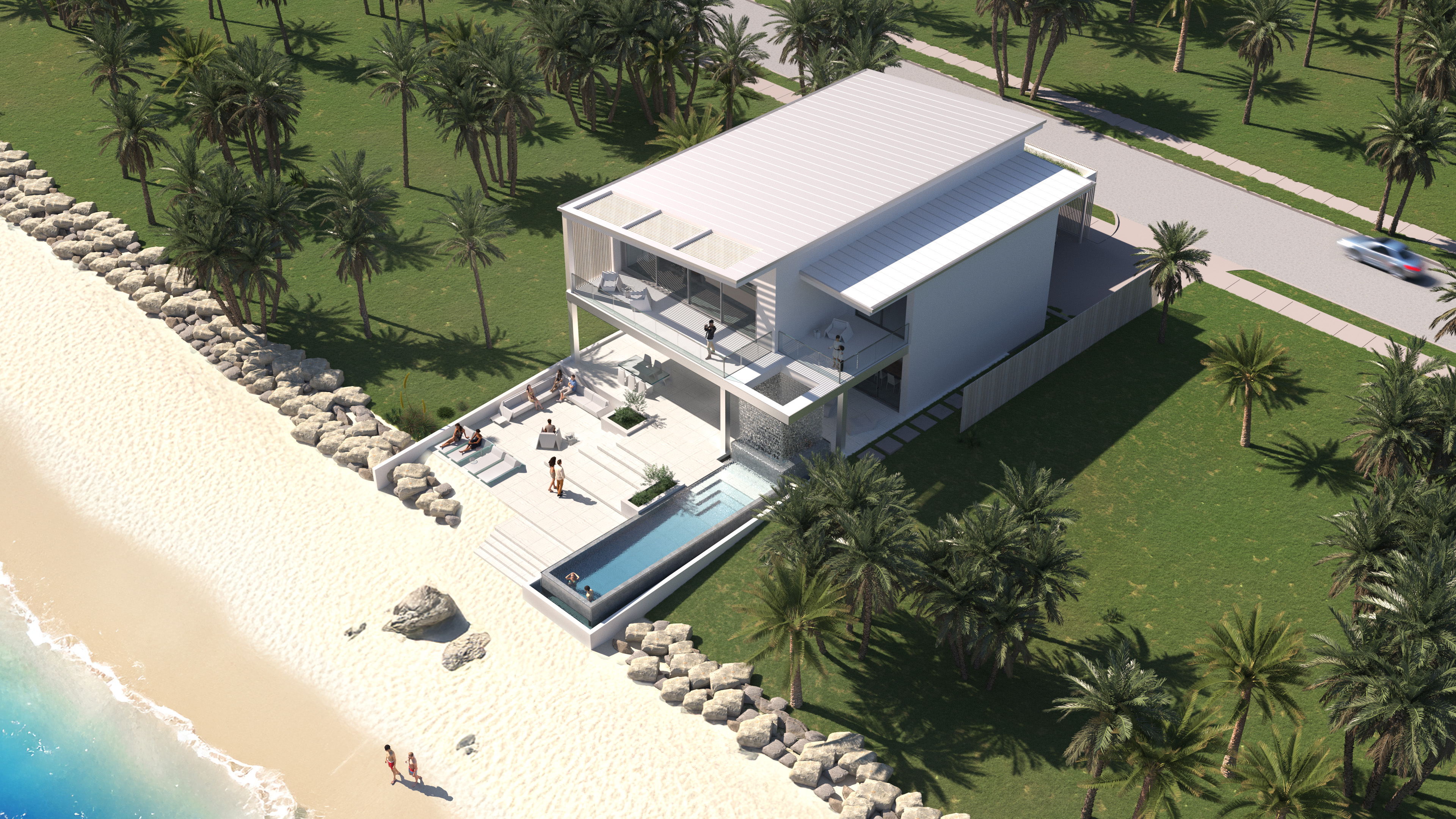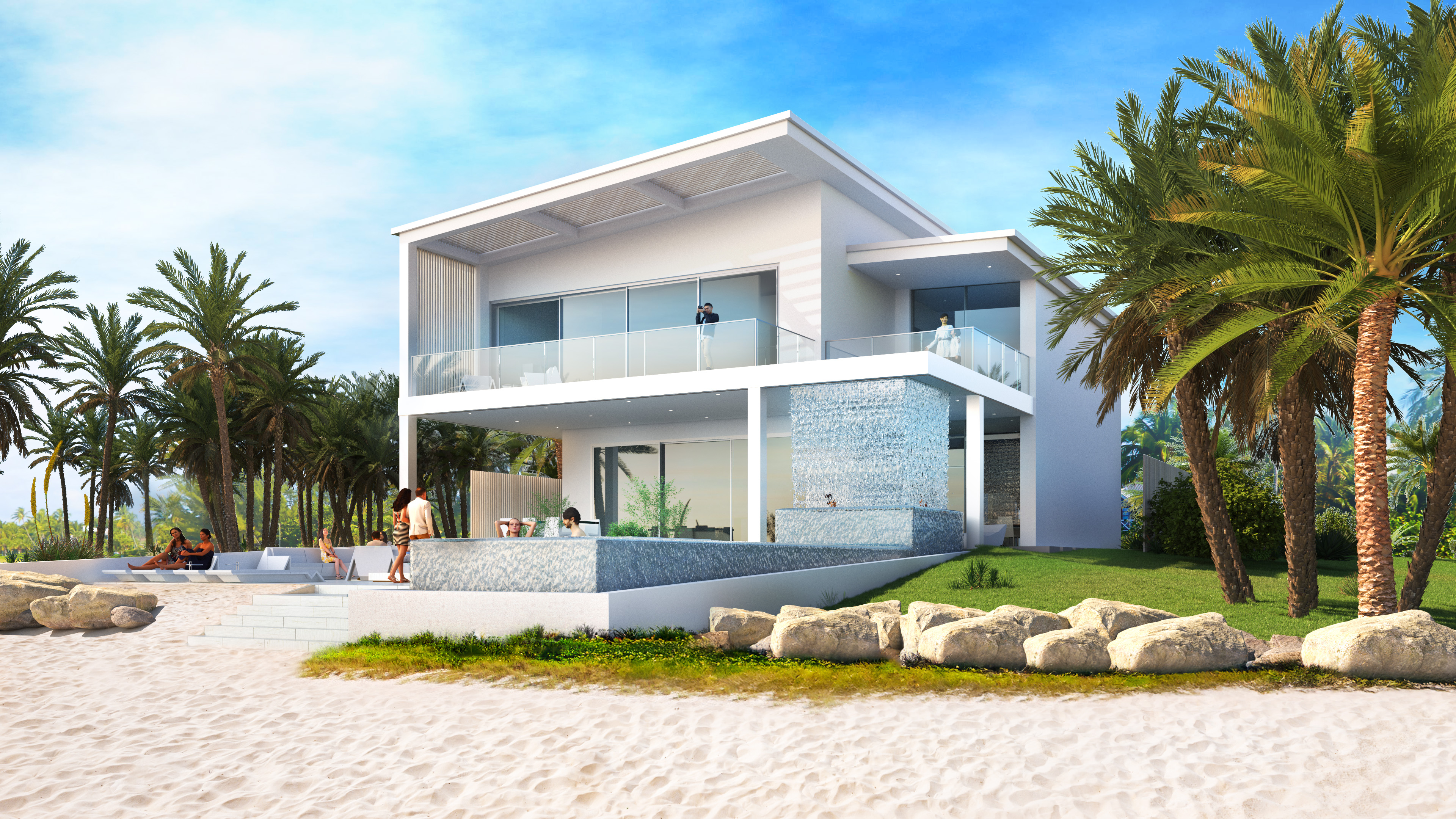 This 3 bedroom, 2 ½ bath, oceanfront retreat is an efficient admission into beachside living. The two-story home has an expansive backyard that invites landscape into the chaise lounge area while also reaching out to the ocean beyond. The modestly sized square footage maximizes the buildable area of the small site footprint. To make spaces feel larger, many rooms are designed to open and integrate with outdoor balcony and terrace space. West facing balconies offer breathtaking views to the sunset over the Gulf of Mexico. Recessed water channels cascade a waterfall around the jacuzzi for scenic backdrops to the dining area, and serenity within the water. The waterfall feature creates a calming white noise that produces a sense of privacy in an open amenity area. Enjoy a swim in the ocean and walk right up to a variety of outdoor lounge furniture to bask in the sunlight.